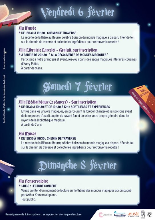 A noter également Du 6 au 8 février 2026, Saint-Dizier se met à l’heure de l’imaginaire avec le Week-end Magique, un événement porté par le réseau des médiathèques La Constellation, en partenariat avec la Ville de Saint-Dizier et Grand Saint-Dizier Der & Vallées. Cette programmation exceptionnelle s’appuie également sur la collaboration de plusieurs acteurs culturels du territoire : la Librairie Carcellet, la Médiathèque, le Musée de Saint-Dizier et le Conservatoire, qui uniront leurs univers pour proposer animations, jeux, lectures et expériences enchantées accessibles dès 7 ans. Trois jours pour explorer les mondes magiques et vivre la culture autrement, dans un esprit ludique et familial.