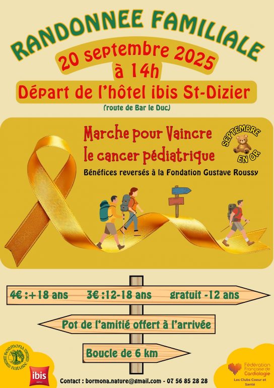 Un des événements phares de cette mobilisation est la marche pour vaincre le cancer pédiatrique. Il s’agit d’une randonnée familiale de 6 km qui se tiendra à Bettancourt-la-Ferrée, près de Saint-Dizier. Cette initiative permet aux participants de se rassembler et de montrer leur soutien de manière active. Après la marche, un pot de l’amitié est offert pour un moment de convivialité. Tous les bénéfices de cette action seront directement reversés à la Fondation Gustave Roussy.
