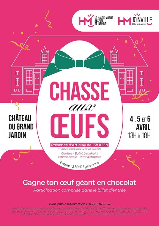 Le printemps est là, et avec lui, le coup d’envoi de la saison touristique à Joinville. Pour marquer l’événement, le Château du Grand Jardin vous invite à sa troisième édition de la grande chasse aux œufs. Que vous soyez en famille, entre amis ou simple amoureux des vieilles pierres, c’est le rendez-vous incontournable du week-end de Pâques !