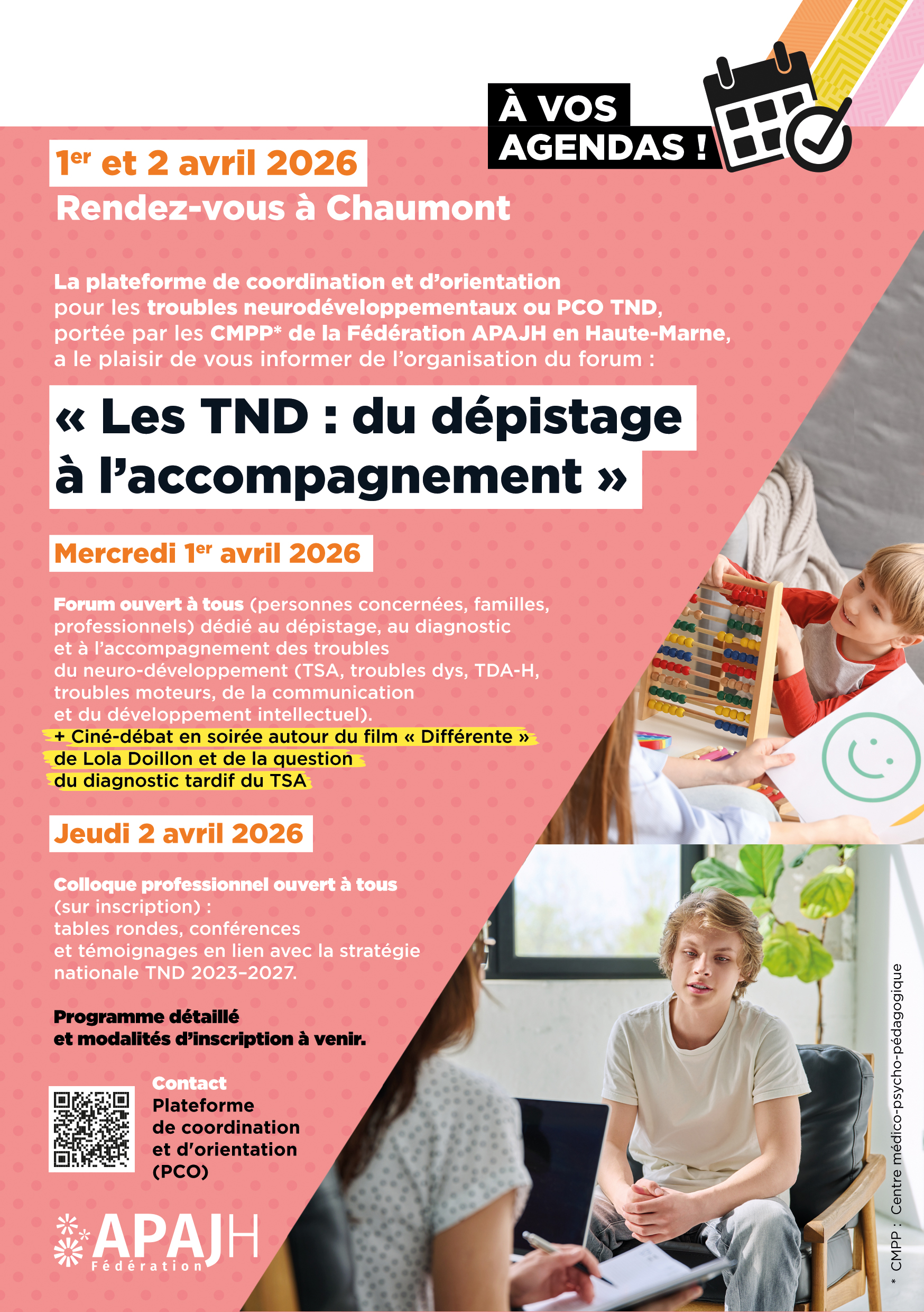 La Plateforme de Coordination et d’Orientation TND (Troubles du neurodéveloppement) de Haute-Marne, portée par les CMPP (Centres médico-psycho-pédagogiques) de la Fédération APAJH (Association pour adultes et jeunes handicapés), organise ce mercredi 1er avril à Chaumont un forum grand public consacré aux troubles du neurodéveloppement. Ouvert à tous, il réunira familles, personnes concernées, professionnels et structures du territoire autour des questions de repérage, de diagnostic et d’accompagnement.
