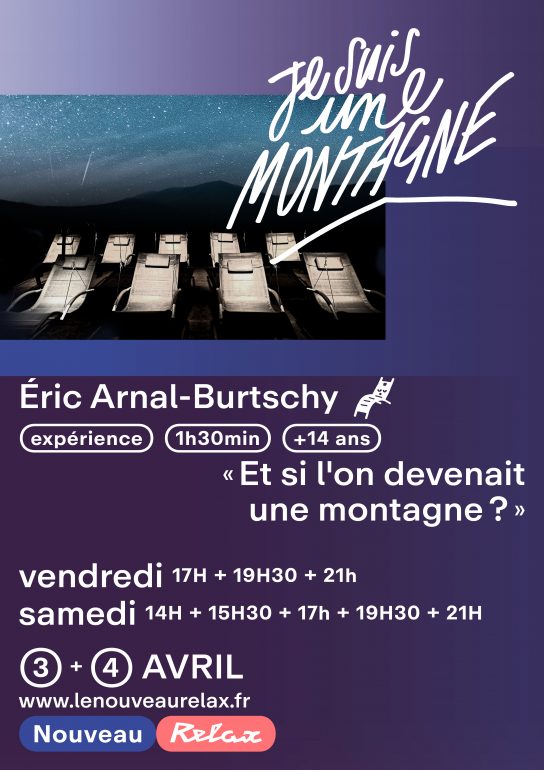 Le mois d’avril s’ouvre au Nouveau Relax avec une proposition singulière, à la frontière du spectacle et de l’expérience. Les vendredi 3 et samedi 4 avril, Éric Arnal-Burtschy présente Je suis une montagne, une création immersive destinée au public à partir de 14 ans. Sans acteur, mais avec un important travail sur les sensations, la lumière, le son et les vibrations, cette expérience invite les spectateurs à se glisser dans un autre rapport au temps et au vivant. Dans le noir, au cœur d’une installation suspendue, chacun est invité à ressentir les éléments, à se laisser traverser par la matière, le vent ou le grondement de la terre. Une proposition sensorielle et méditative, qui se vit à plusieurs horaires répartis sur les deux jours.