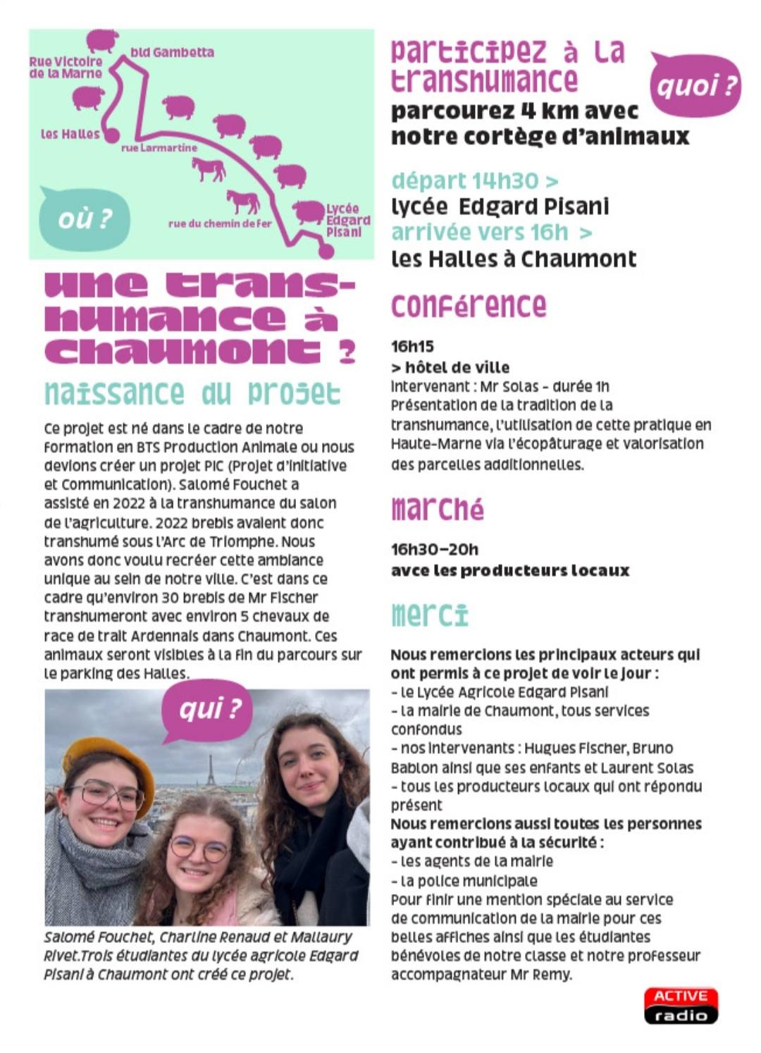 Dans le cadre d’un projet scolaire, Salomé, Charline et Mallaury, étudiantes au CFA agricole au sein du lycée Edgard-Pisani de Chaumont, organisent une transhumance (migration périodique du bétail entre les pâturages d’hiver et les pâturages d’été) ovine le mercredi 2 avril 2025, à partir de 14h30, depuis leur établissement jusqu’aux Halles. Avec une arrivée prévue autour de 16h, une conférence suivra à l’Hôtel de Ville puis un marché nocturne au sein du marché couvert. Zoom en podcast.