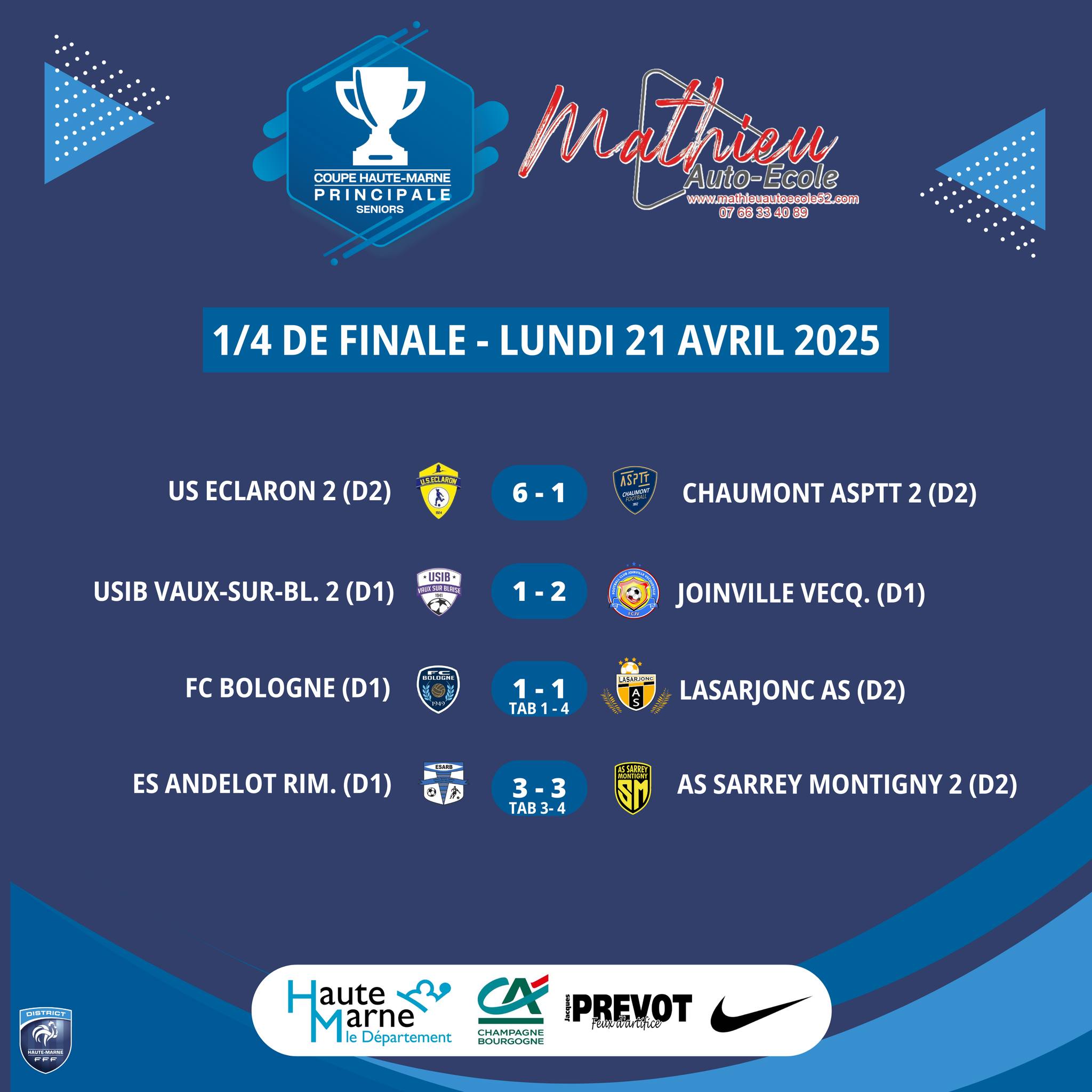 Coupe de Haute-Marne, 1/4 de finale. En ce lundi de Pâques, les clubs haut-marnais encore en lice se disputaient les 1/4 de finale des coupes à la fois principale et consolante. Dans la première, Joinville et Eclaron “2” se sont logiquement imposés et qualifiés, alors qu’Andelot et Bologne, têtes de série de D1, se sont fait surprendre par des clubs de D2 en se faisant éliminer par la terrible épreuve des tirs au but. En consolante, la logiquement a globalement été respectée avec notamment une cascade de but bourbonnaise face à Saulxures, 0-10, sauf pour la D3 de Doulaincourt qui a éliminé le CS Bragard (D2), 4-2. Tirage au sort des demi-finales en début de semaine prochaine. Débrief en podcast.