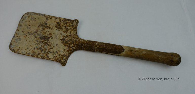 Pelle de tranchée française ayant servi durant la Première Guerre mondiale. Elle était utilisée pour creuser les sapes (tranchées ou fosses) sous les constructions ennemies afin de les faire écrouler. D’après l’inventaire, cette pelle a été utilisée pour le creusement des sapes d’Argonne.