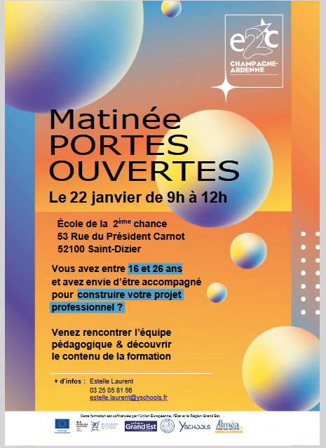 Les Écoles de la Deuxième Chance (E2C) continue d’offrir des solutions concrètes aux jeunes en quête de projet professionnel. L’équipe pédagogique de l’E2C Saint-Dizier vous invite à découvrir sa pédagogie innovante lors de sa matinée portes ouvertes ce jeudi 22 janvier 2026.