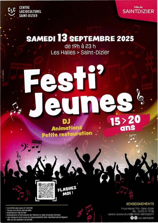 Le Festi’Jeunes fait son grand retour à Saint-Dizier le samedi 13 septembre 2025. Organisé par le Centre Socioculturel de Saint-Dizier, cet événement est spécialement conçu pour les jeunes de 15 à 20 ans.