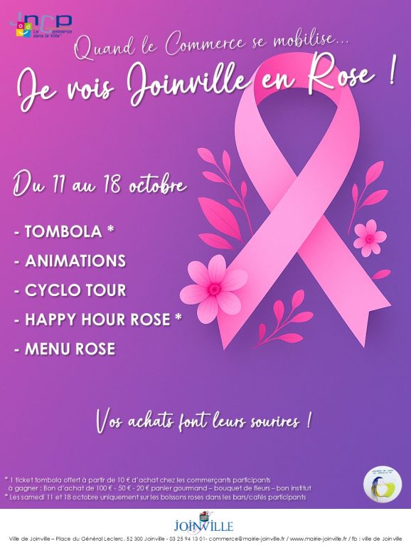 Pendant une semaine, la municipalité et les commerçants joinvillois transforment le centre-ville en un lieu d’émotion, de convivialité et de soutien à la lutte contre le cancer du sein. Chaque achat, chaque participation aux animations, devient un geste concret pour la cause. Le rose, couleur d’espoir, illumine les rues et les vitrines pour rappeler qu’ensemble, nous pouvons faire la différence.