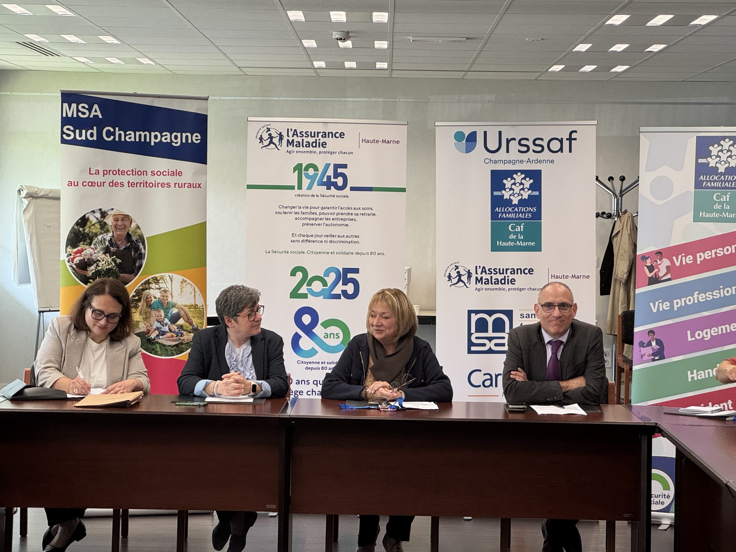 De g. à d. : Marie-Charlotte Kossmann-Mathon, directrice de la Caf 52, Delphine Arambourou-Martin, Laurence Meunier, et Franck Lamartine, directeur de l’Urssaf Champagne-Ardenne