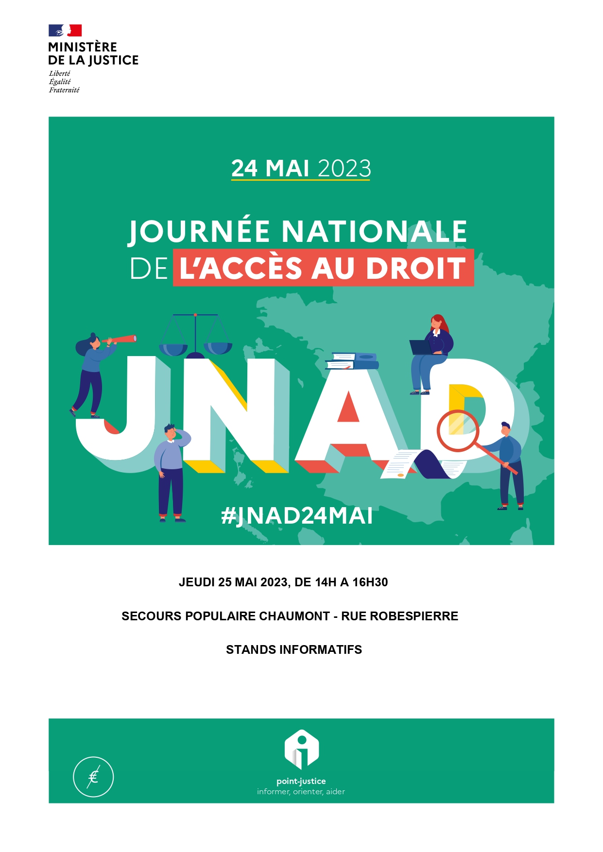 Jeudi 25 mai 2023, de 14h à 16h30 : accès au droit des plus vulnérables à Chaumont – stands informatifs (CDAD/ADAJ/CIDFF/Familles Rurales/AHMI) au sein du Secours Populaire à Chaumont (rue Robespierre)