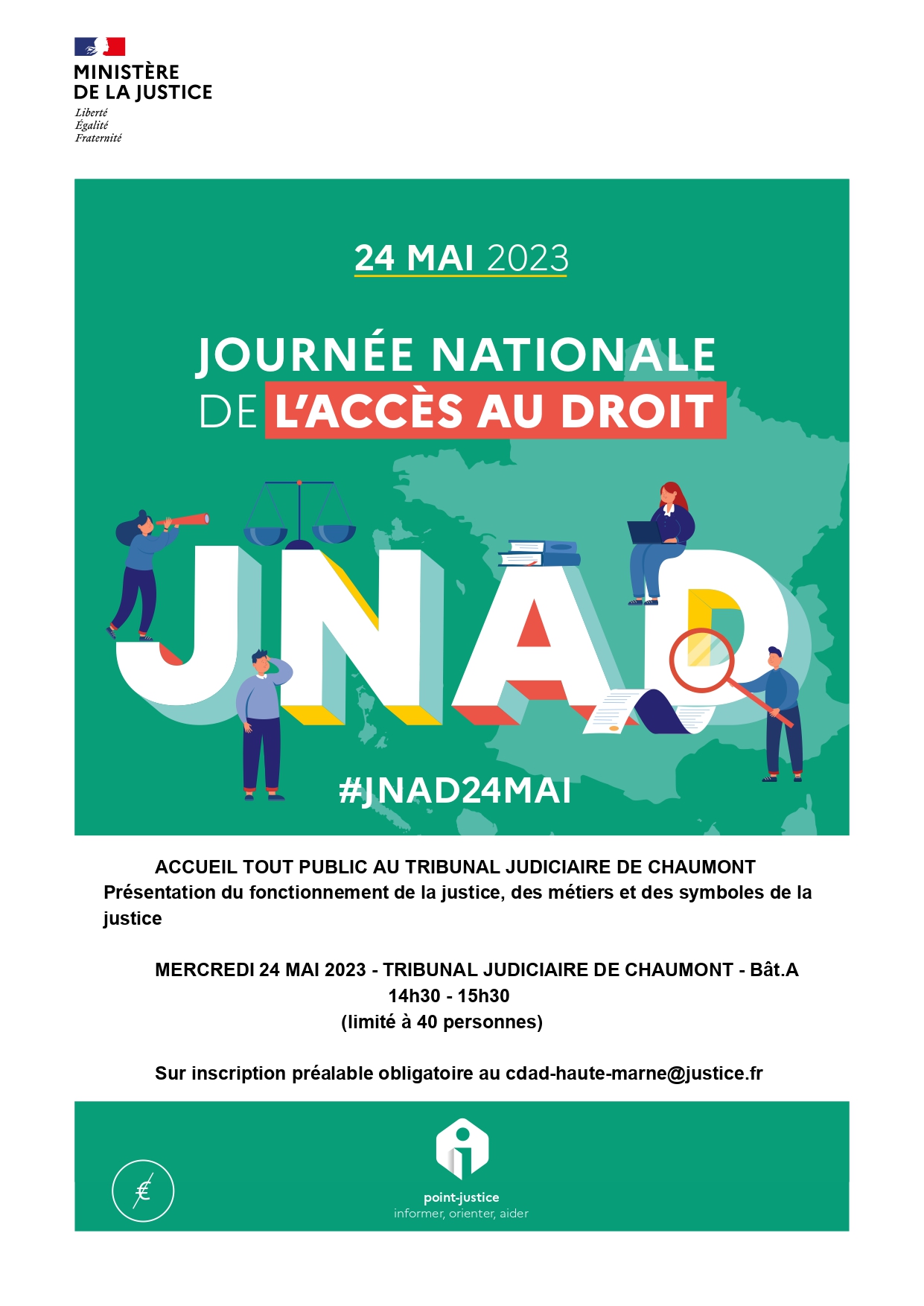 Les scolaires doivent obligatoirement s’inscrire auprès du CDAD52 cdad-haute-marne@justice.fr pour la visite de la MJD le mardi 23 mai, ainsi que pour les deux créneaux proposés le matin du mercredi 24 mai pour la visite du tribunal de Chaumont (affiches ci-dessous).
