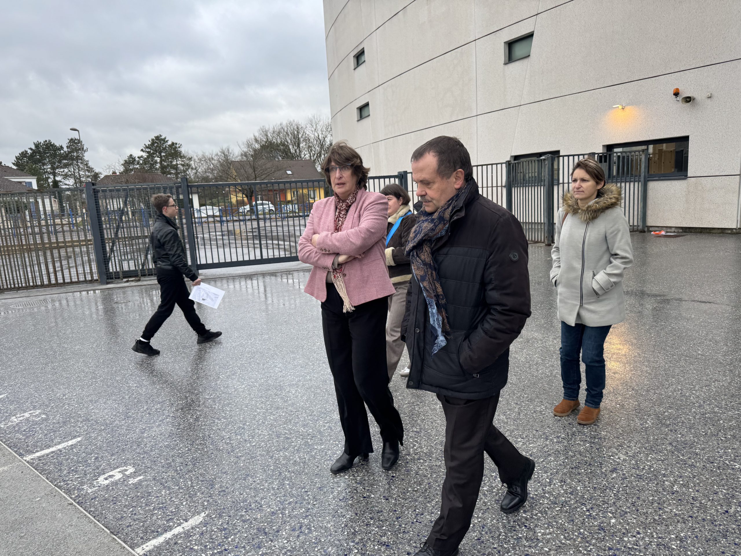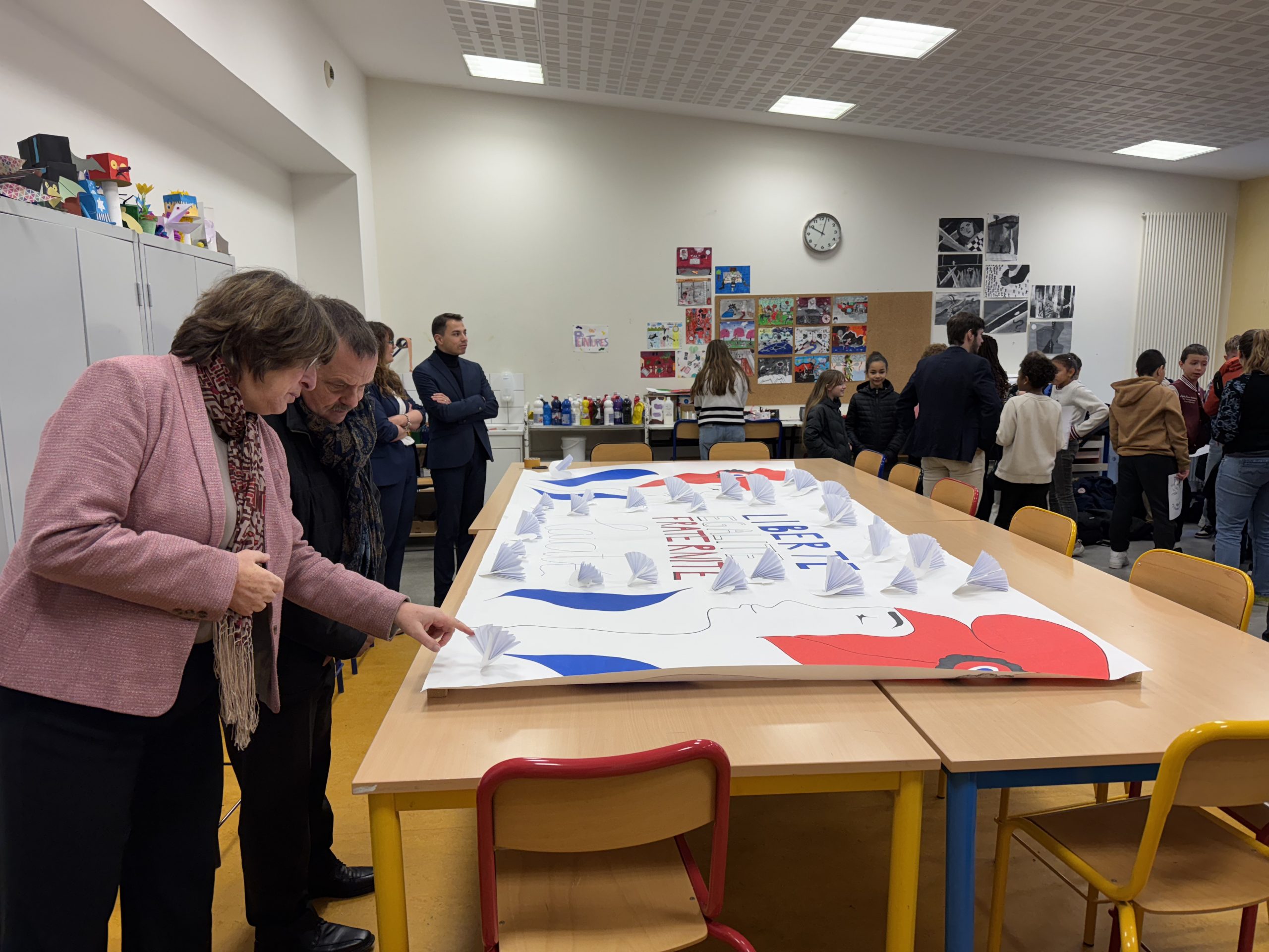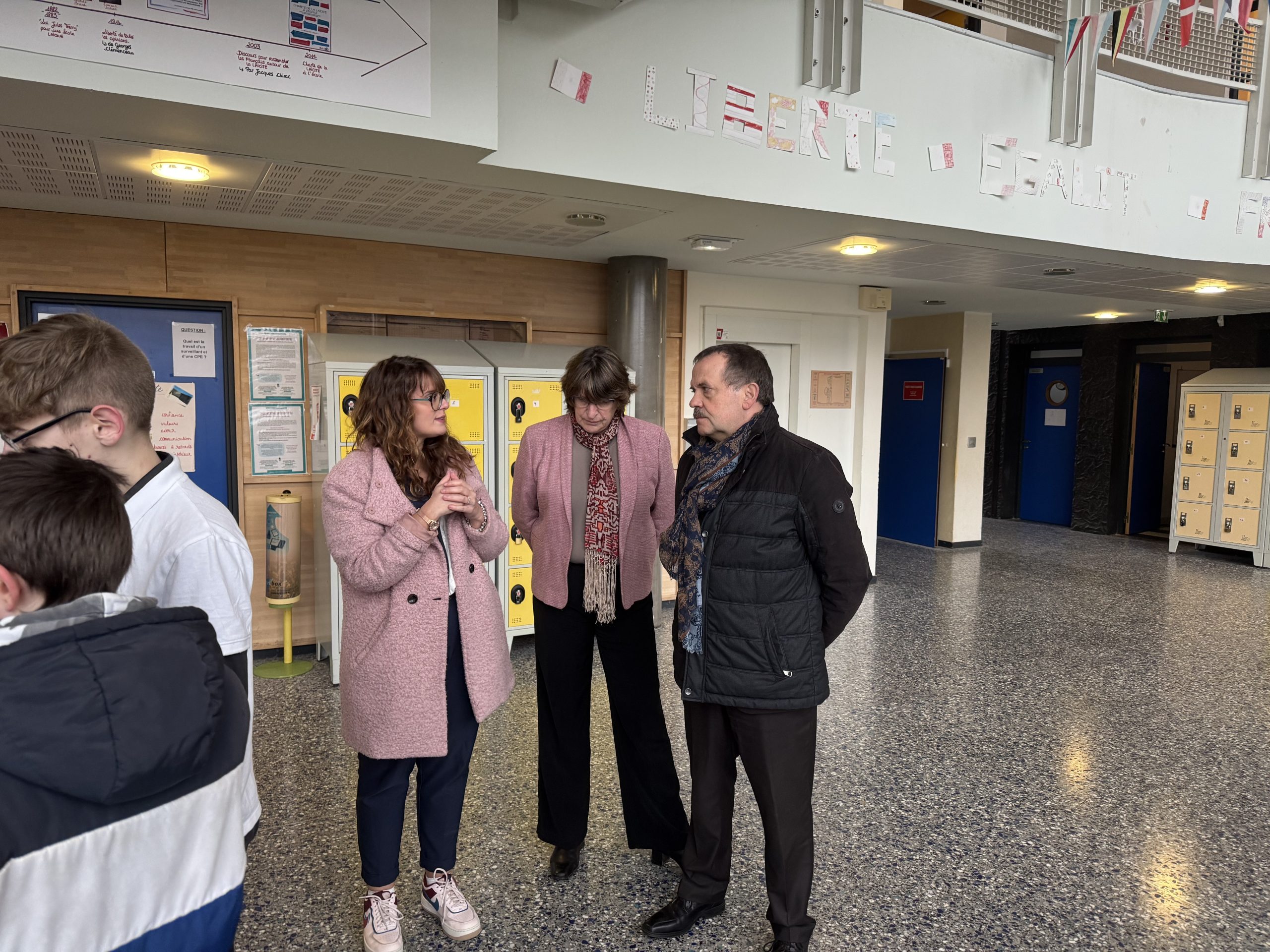 L’Inspecteur d’Académie a pu découvrir les différents travaux menés par le personnel scolaire lundi matin, accompagné de la proviseure de l’établissement (en rose) :