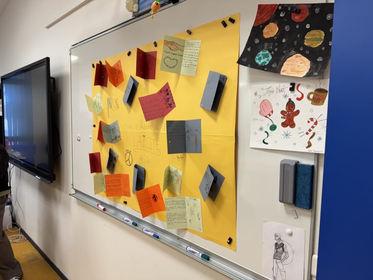 A l’occasion de la Journée nationale de la Laïcité ce lundi 9 décembre 2024, le collège La Rochotte de Chaumont a préparé différentes activités à ses élèves, avec notamment une course d’orientation dès le matin, un arbre de la laïcité a été déposé dans le hall de l’établissement où les jeunes de toutes classes ont pu y accrocher différents bonnets phrygiens sur lesquels étaient écrits des mots en lien avec le sujet, à la manière d’un sapin de Noël. Deux classes de 6e avait également préparé une fresque représentant la laïcité ainsi qu’une charte de la laïcité de manière artistique (voir photos). Pour l’occasion, le Directeur Académique des Services de l’Education Nationale (DASEN) de la Haute-Marne, Michel Fonné, s’est rendu sur place ce lundi matin. Podcasts avec l’Inspecteur d’Académie et plusieurs collégiens.