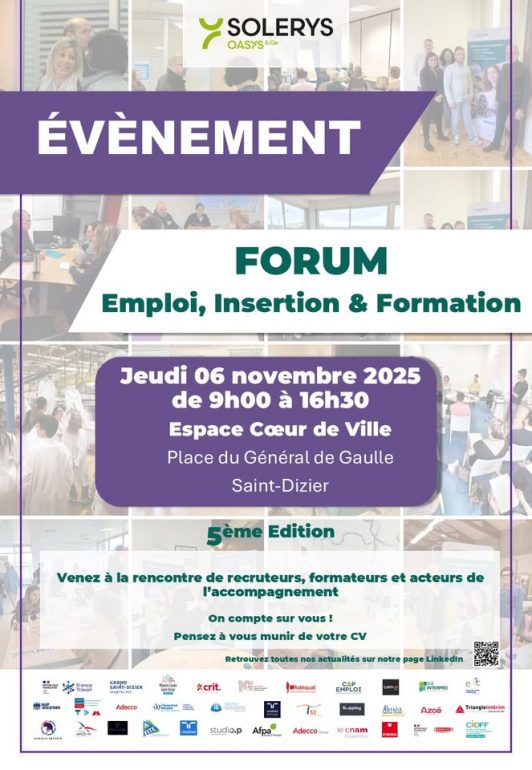 Le cabinet Solerys organise la 5e édition de son Forum Emploi, Insertion & Formation le jeudi 6 novembre 2025 à l’Espace Cœur de Ville de Saint-Dizier.