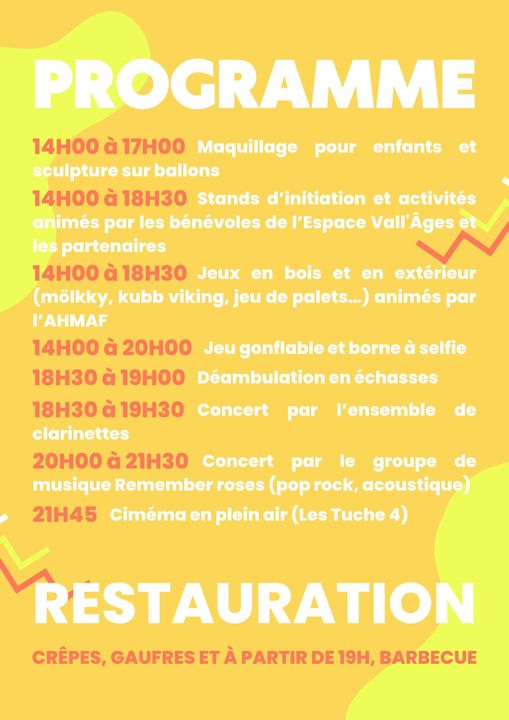 Au programme : des stands d’initiation, des jeux animés par les bénévoles et partenaires, ainsi que des activités pour les enfants (maquillage, sculpture sur ballons, déambulations en échasses, jeu gonflable …). Il y aura également des concerts à partir de 18h30 et une restauration avec des crêpes, des gaufres et un barbecue à partir de 19h. Une séance de cinéma en plein air avec la diffusion des Tuches 4 à partir de 21h45 clôturera la soirée.
