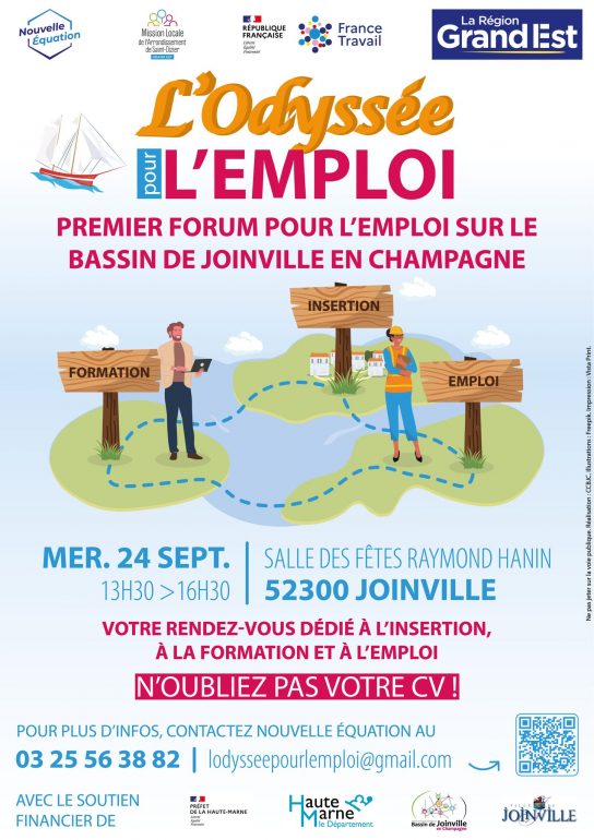 Nouvelle Équation et tous les partenaires vous attendent nombreux pour faire de cette “Odyssée” un véritable succès et un tremplin vers l’emploi. Rendez-vous ce mercredi 24 septembre à partir de 13h30 à la salle des fêtes Raymond Hanin de Joinville, entrée libre !