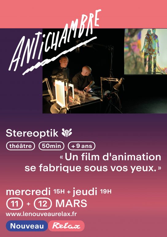 Les mercredi 11, 15h, et jeudi 12 mars à 19h, place à Antichambre, un poème visuel et musical imaginé par le duo STEREOPTIK. Pendant 50 minutes, dès 9 ans, les spectateurs assistent à la fabrication d’un film d’animation sous leurs yeux.