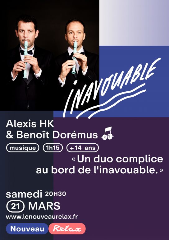 Le samedi 21 mars à 20h30, la musique prend une tournure théâtrale avec Inavouable, porté par Alexis HK et Benoît Dorémus. Pendant 1h15, à partir de 14 ans, les deux artistes se retrouvent en loge et donnent à voir un concert construit dans l’intimité de cet entre-deux.