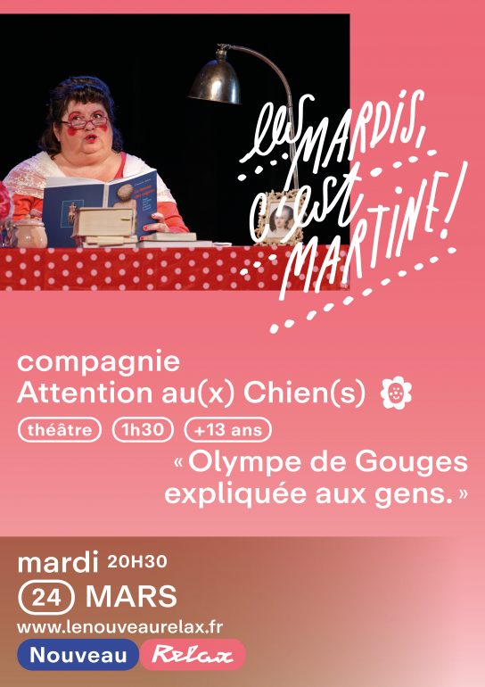 Le mardi 24 mars à 20h30, la compagnie Attention Au(x) Chien(s) poursuit son cycle « Les mardis, c’est Martine ! » avec Olympe de Gouges expliquée aux gens. Cette création maison d’1h30, conseillée dès 13 ans, met à l’honneur la figure de l’autrice de la Déclaration des droits de la femme et de la citoyenne.