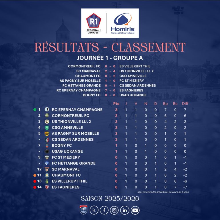 Départemental 1 haut-marnais 2025/2026, Journée 1. Pour la reprise du plus haut niveau départemental en Haute-Marne, beaucoup de suspense et d'incertitudes quant au classement final que l'on retrouvera en juin prochain. Certains comme Bologne, Joinville ou encore Neuilly-l'Evêque font office de favoris, quand des outsiders comme Vaux-sur-Blaise ou Saints-Geosmes peuvent venir titiller le haut de classement, sans savoir ce que vont proposer les promus de D2, à savoir les réserves […]