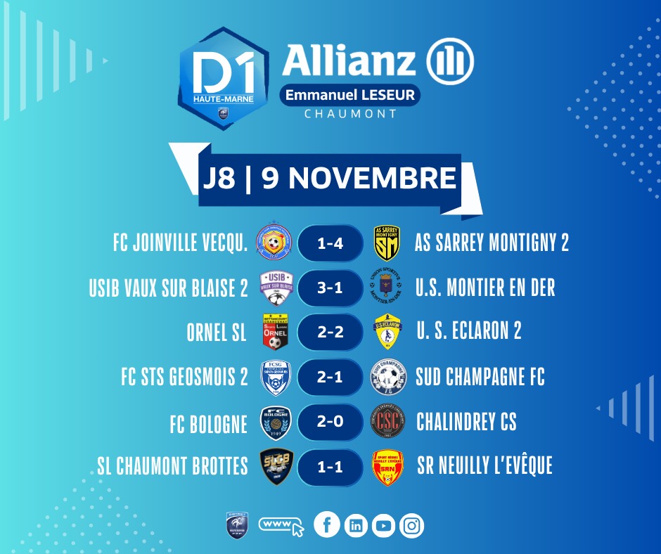 Départemental 1 haut-marnais 2025/2026, Journée 9. Après cette 9e Journée, un véritable bloc de quatre équipes se détache en haut de classement, à commencer par leader, le FC Bologne confirme sa grande forme en s’imposant contre le CS Chalindrey (2-0). Derrière, les réserves de l’AS Sarrey/Montigny, du FC Saints-Geosmes et de l’USIB Vaux-sur-Blaise ont aussi engrangé les trois points en gagnant respectivement face au FC Joinville/Vecqueville (4-1), contre le Sud Champagne FC (2-1) et l’US Montier-en-Der (3-1). Tous les résultats ci-dessous. A noter que Yannick Collignon (SCFC) rejoint Lucas Champion (SRN) en tête du classement des buteurs avec 8 réalisations.