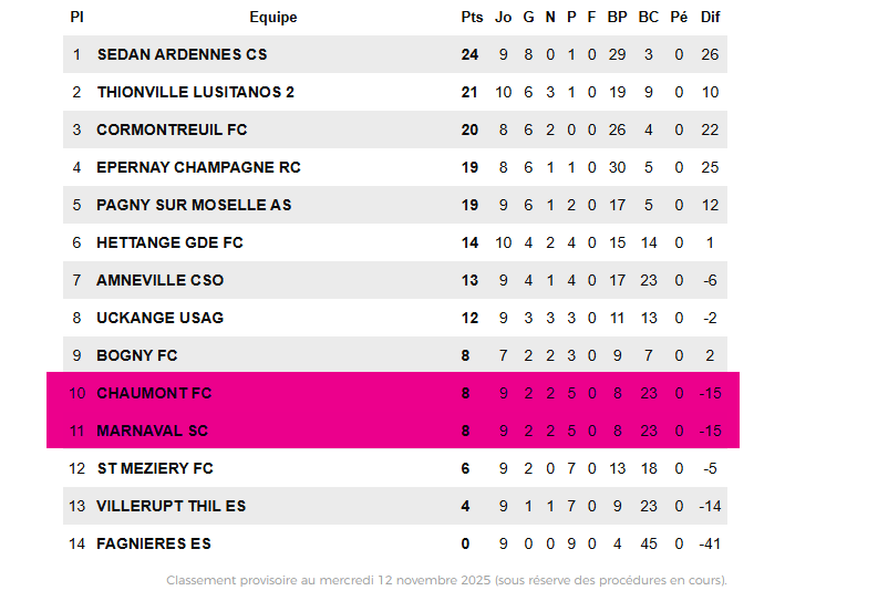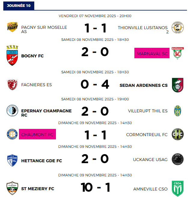 R1 J10 & D1 J9 : Chaumont tient en échec un cador, Marnaval perd, en D1 Bologne mène la danse