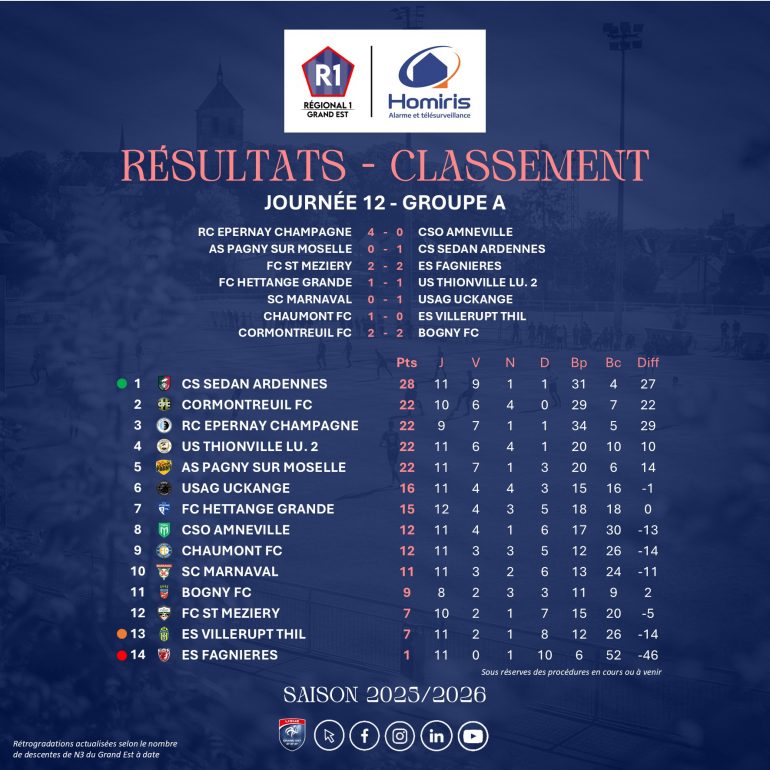 Régional 1 Grand Est 2025/2026, Poule A, Journée 12. Une journée contrastée pour les clubs haut-marnais en Régional 1. Sous la pluie de son terrain synthétique Pierre-Flamion, le Chaumont FC a enchaîné un cinquième match sans défaite grâce à un but décisif d’Artyom Balayan et à une nouvelle prestation solide d’Antonin Pèche dans les buts, confirmant sa bonne forme du moment. De son côté, le SMC Marnaval a manqué l’occasion de frapper un grand coup contre l’USAG Uckange : malgré plusieurs occasions franches, les hommes d’Antoine Briard ont cédé sur l’unique but du match et réalisent une mauvaise opération comptable à domicile.