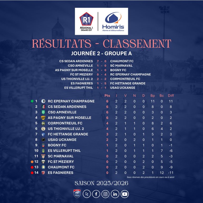 Régional 1 Grand Est 2025/2026, poule A, Journée 2. Week-end bien compliqué pour les clubs haut-marnais. À Sedan, le Chaumont FC n’a rien pu faire face au grand favori du championnat : les “Sangliers” ont déroulé, infligeant un sévère 7-0 aux préfectoraux, dépassés dans tous les compartiments du jeu malgré une petite alerte signée Janyce Lula. Une claque qui rappelle la difficulté d’un tel déplacement, face à une équipe armée pour viser la montée, et qui se déplacera sur le terrain de Marnaval dès ce week-end. De son côté donc, le SMC Marnaval a longtemps espéré mieux à Amnéville. Dominés en première période et punis sur une contre-attaque, les marnavalais ont ensuite montré un tout autre visage, multipliant les occasions après la pause, jusqu’à toucher la barre dans les arrêts de jeu. Mais leurs efforts sont restés vains et ils s’inclinent finalement 1-0. Deuxième revers d’affilée pour Chaumont et Marnaval, qui devront chercher à se relancer dès le prochain week-end pour éviter de s’installer en bas de tableau.