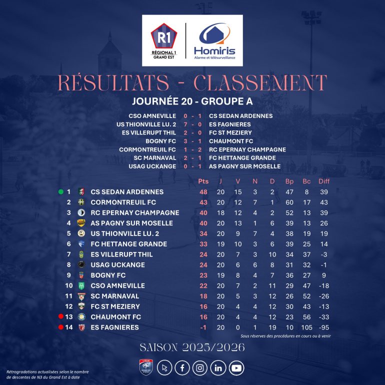 Régional 1 Grand Est 2025/2026, Poule A, Journée 20. Un week-end contrasté pour les clubs haut-marnais, avec une victoire capitale pour Marnaval dans la course au maintien contre Hettange-Grande (2-1), tandis que Chaumont continue de s’enfoncer à Bogny avec un groupe toujours plus amoindri, malgré un contenu parfois encourageant. Les nordistes respirent, les préfectoraux restent sous pression dans la zone rouge. Tout ça à deux semaines du derby haut-marnais entre les deux équipes…