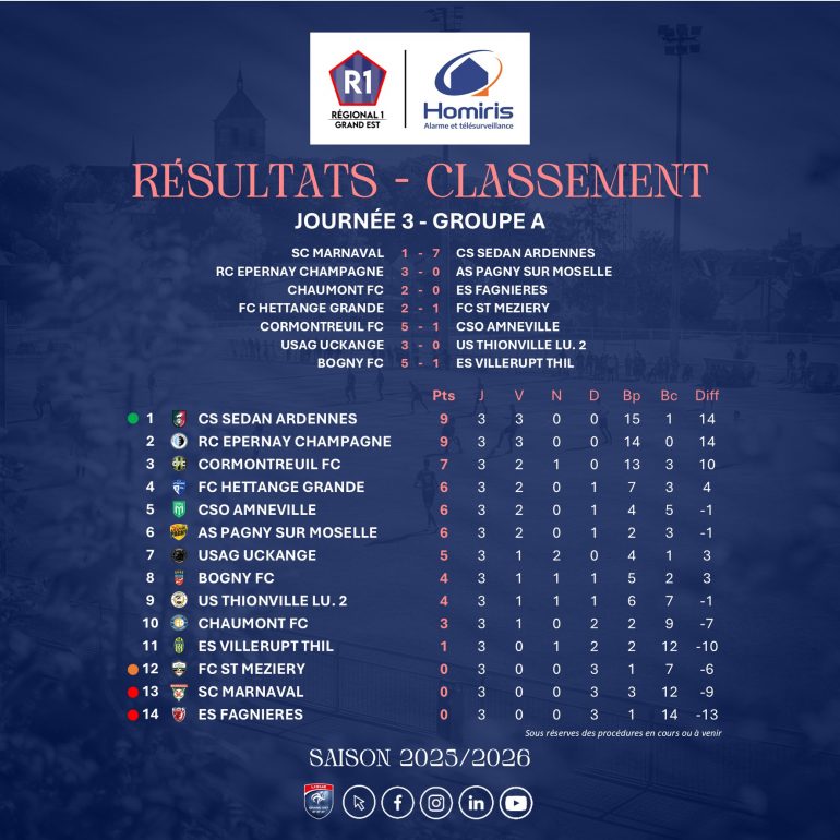 Régional 1 Grand Est 2025/2026, poule A, Journée 3. Enfin une bouffée d’air pour le Chaumont FC, qui décroche son premier succès de la saison à domicile face à l’ES Fagnières (2-0). Portés par les belles prestations de leurs nouveaux titulaires dont le buteur Page et par un autre but de Jannel, les chaumontais ont assuré l’essentiel dans ce duel pour le maintien, malgré beaucoup de déchet technique. En revanche, la soirée de samedi a été bien plus douloureuse pour le SMC Marnaval, balayé à domicile par Sedan (1-7). Les marnavalais, courageux en début de seconde période et brièvement relancés par un but de Camara, n’ont pas résisté à l’armada ardennaise qui a déroulé après l’heure de jeu. Un week-end en clair-obscur pour les clubs haut-marnais, entre soulagement du côté de Chaumont et inquiétude persistante pour Marnaval, toujours bloqué à zéro point après trois journées.