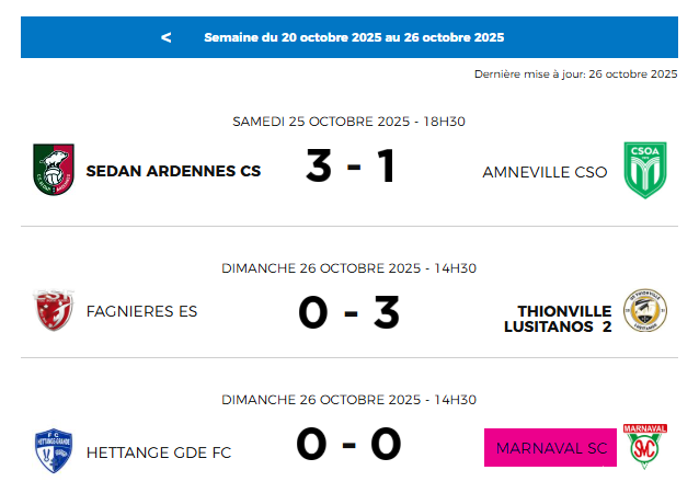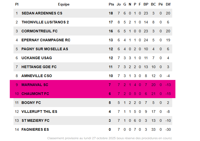 Régional 1 Grand Est 2025/2026, poule A, Journée 8. Marnaval a ramené un point précieux de son déplacement à Hettange-Grande (0-0), au terme d’un match très compliqué. Longtemps dominés, les marnavalais ont tenu bon grâce à une défense solide et à un Corey Avert décisif, de retour dans les cages après sa suspension. Le portier marnavalais a multiplié les arrêts, repoussant notamment un penalty en première période et préservant le “clean-sheet” malgré les vagues offensives adverses. Peu inspirés offensivement et techniquement mais solidaires, les hommes d’Antoine Briard ont fait bloc pour sauver ce nul, même s’ils auraient pu espérer mieux en fin de match, sur une main non sifflée dans la surface. Un point arraché avec le cœur, qui confirme la montée en puissance d’un groupe en progrès défensif, avant d’espérer retrouver plus d’allant devant. Maintenant, les esprits sont tournés vers le derby de dimanche à la maison contre le Chaumont FC, qui était au repos ce week-end.