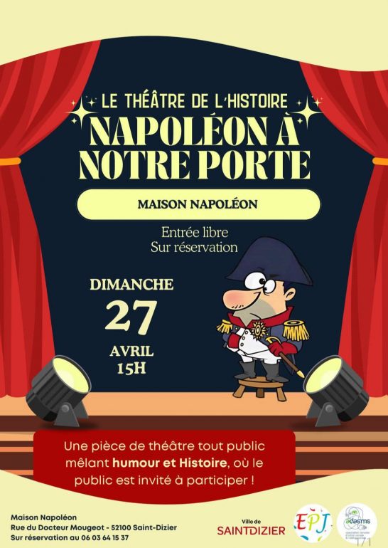 Le week-end se poursuivra le dimanche 27 avril à 15 h à la Maison Napoléon, située au 62 rue du Dr Mougeot à Saint-Dizier. Laissez-vous transporter par un théâtre interactif original et amusant sur le thème “Napoléon à notre porte”. Cette représentation promet de mêler habilement l’histoire locale à des touches d’humour, offrant une perspective nouvelle et divertissante sur une figure emblématique. Venez découvrir ou redécouvrir Napoléon Bonaparte d’une manière inattendue et participative !